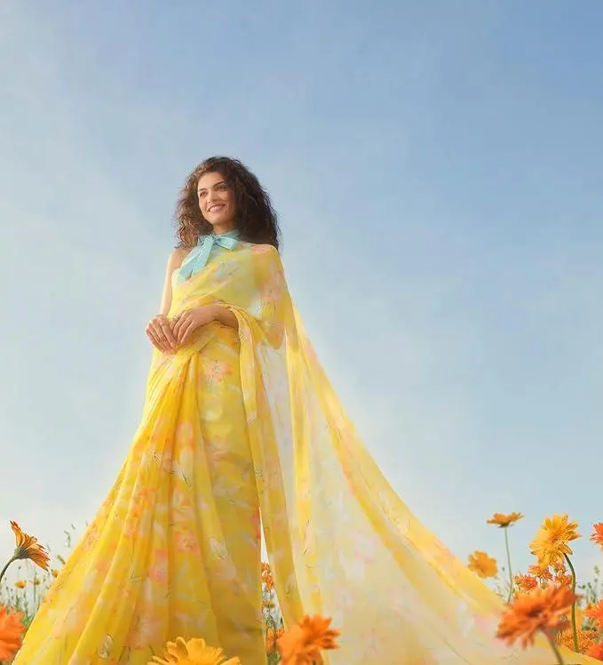 Floral Print Nara Chiffon Yellow Saree